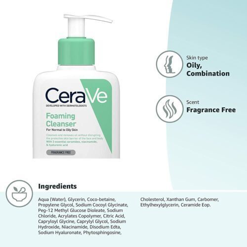 Developed with dermatologists, the foaming gel formula of the CeraVe Foaming Cleanser gently cleanses the skin to remove excess makeup, dirt and oil. It contains 3 essential ceramides to help protect the skin barrier.