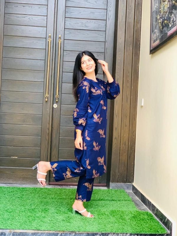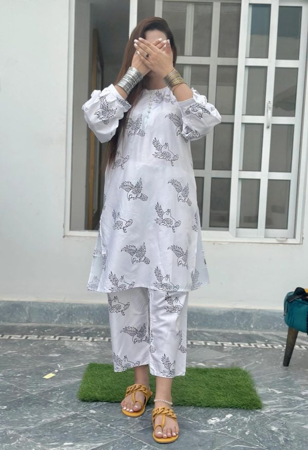 2 Pcs Women’s Stitched Sparrow Print Linen Casual Wear For Women
