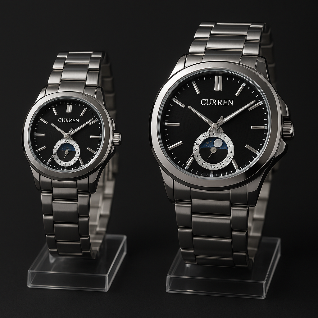Curren Stainless Steel Couple Watch Set With Moonphase Design – Black Dial (with Box)