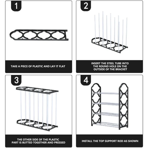 - The shoe rack is assembled from steel pipe and PP plastic connectors. The surface of the steel pipe is smooth and wear-resistant, and the plastic connectors are stable too