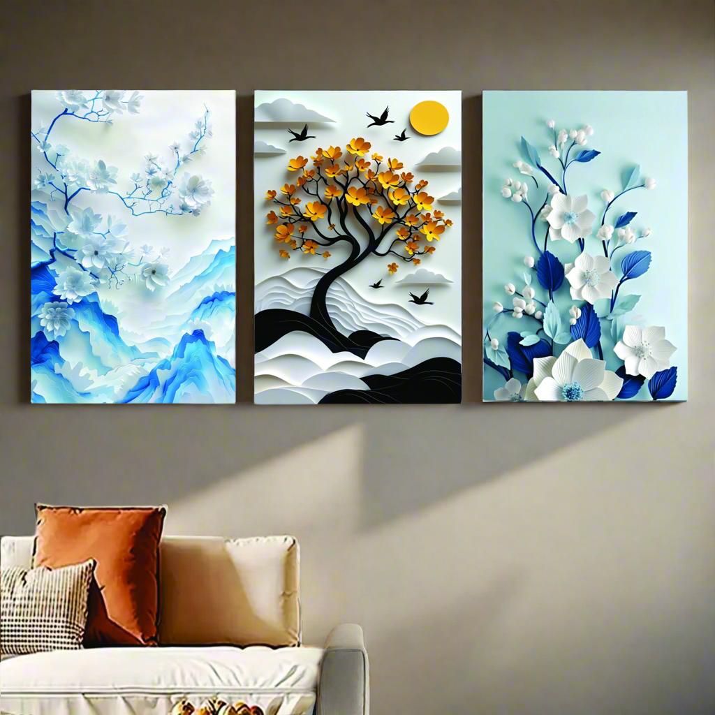 Set Of 3 Flower Tree Art Wooden Frames For Wall Decoration / Sticky Photo Tile